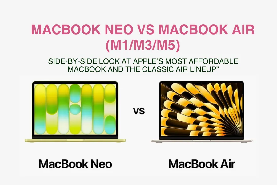 When you compare the MacBook Neo vs MacBook Air (M1/M3/M5), you’re not looking at “good vs bad” laptops, each one is powerful enough for everyday work, but they’re tuned for different needs and budgets. The Neo aims to be the most affordable way to get a modern Mac, while the Air lineup gives you more performance and configuration options as you move up from M1 to M5.